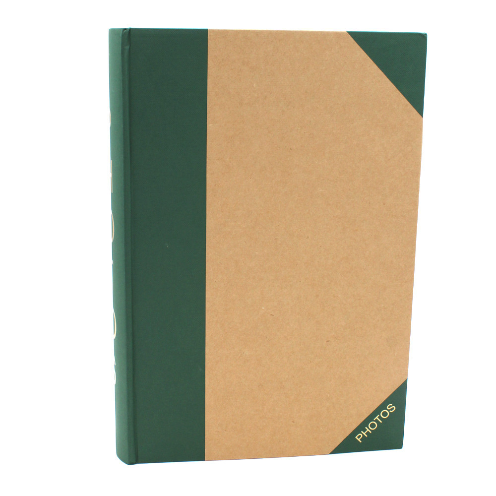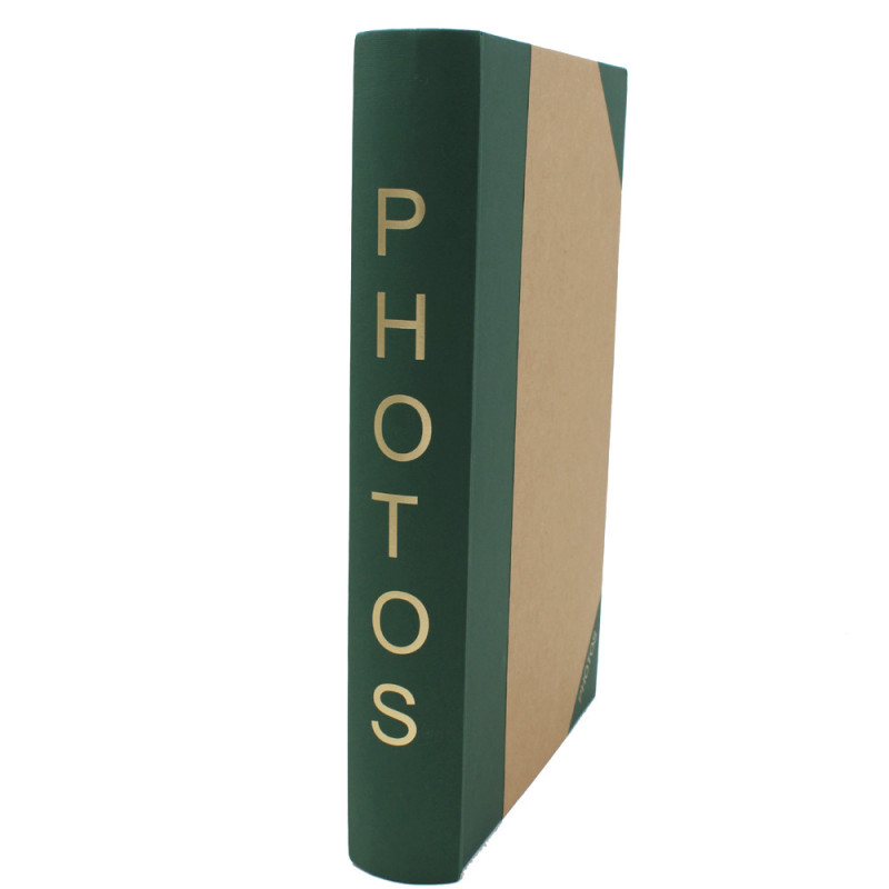 Couverture kraft avec angle et coins colorés en bleu, bordeaux, crème ou noir suivant les modèles. Inscription "PHOTOS" sur le coin droit devant et la tranche de l'album.