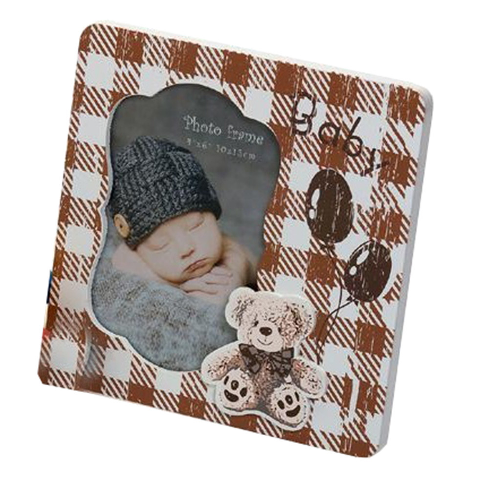 Cadre bébé beige pour une image 10x15 verticale. Une ouverture rectangle aux formes arrondies pour présenter votre photo. Couleur brun clair à carreaux. Un ours en relief retient des ballons. Texte "Baby". Le tout dans les tons brun!