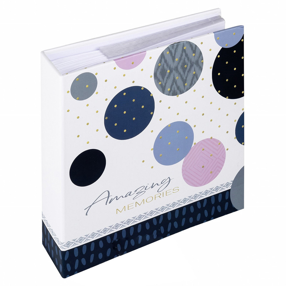 Couverture abstraite illustrée de cercles de diamètre et de couleurs différents. 200 pochettes 10x15 et deux photos par page pour cet album photo "Amazing Memories" de la collection Walther.
