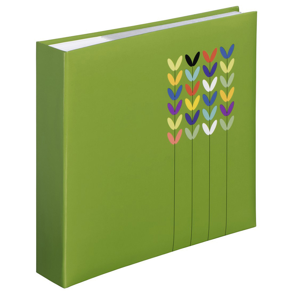 Album photo Blossom N, couverture verte avec dessin de fleurs multicolores. Une capacité de 200 photos 10x15. Glisser vos photos dans les pochettes par le côté. Un espace mémo pour annoter vos photos et une pochette CD à la fin de l'album. Cet album se décline en deux couleurs: lilas et vert.