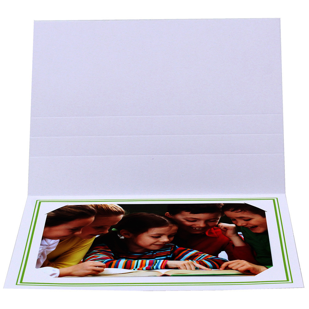 Présentez vos photos en chemises pour un effet professionnel. Modèle "Liseré duo vert clair". L'idéal pour offrir lors de congrès, portes ouvertes, cérémonies, fêtes, repas de club. Cartonnage réalisé sur papier offset blanc de 210 g.