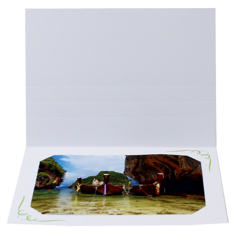 Présentez vos photos en chemises pour un effet professionnel. Modèle "Frise N3 vert clair". L'idéal pour offrir lors de congrès, portes ouvertes, cérémonies, fêtes, repas de club. Cartonnage réalisé sur papier offset blanc de 210 g.