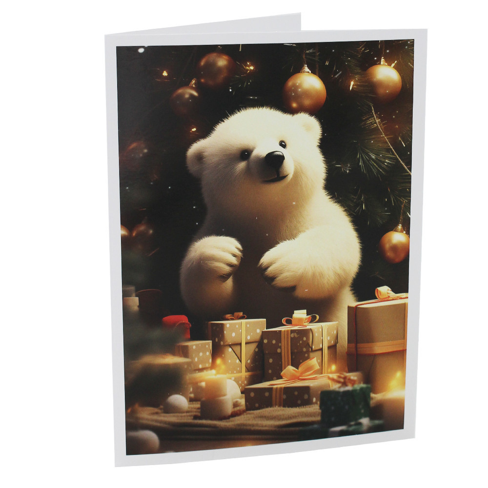 Ce cartonnage photo vertical montre un ours polaire, une peluche dans un style très doux et animé, entouré de cadeaux joliment emballés avec des rubans et des motifs festifs. L’arrière-plan est décoré de boules de Noël suspendues à ce qui semble être un sapin, créant une ambiance festive et joyeuse.