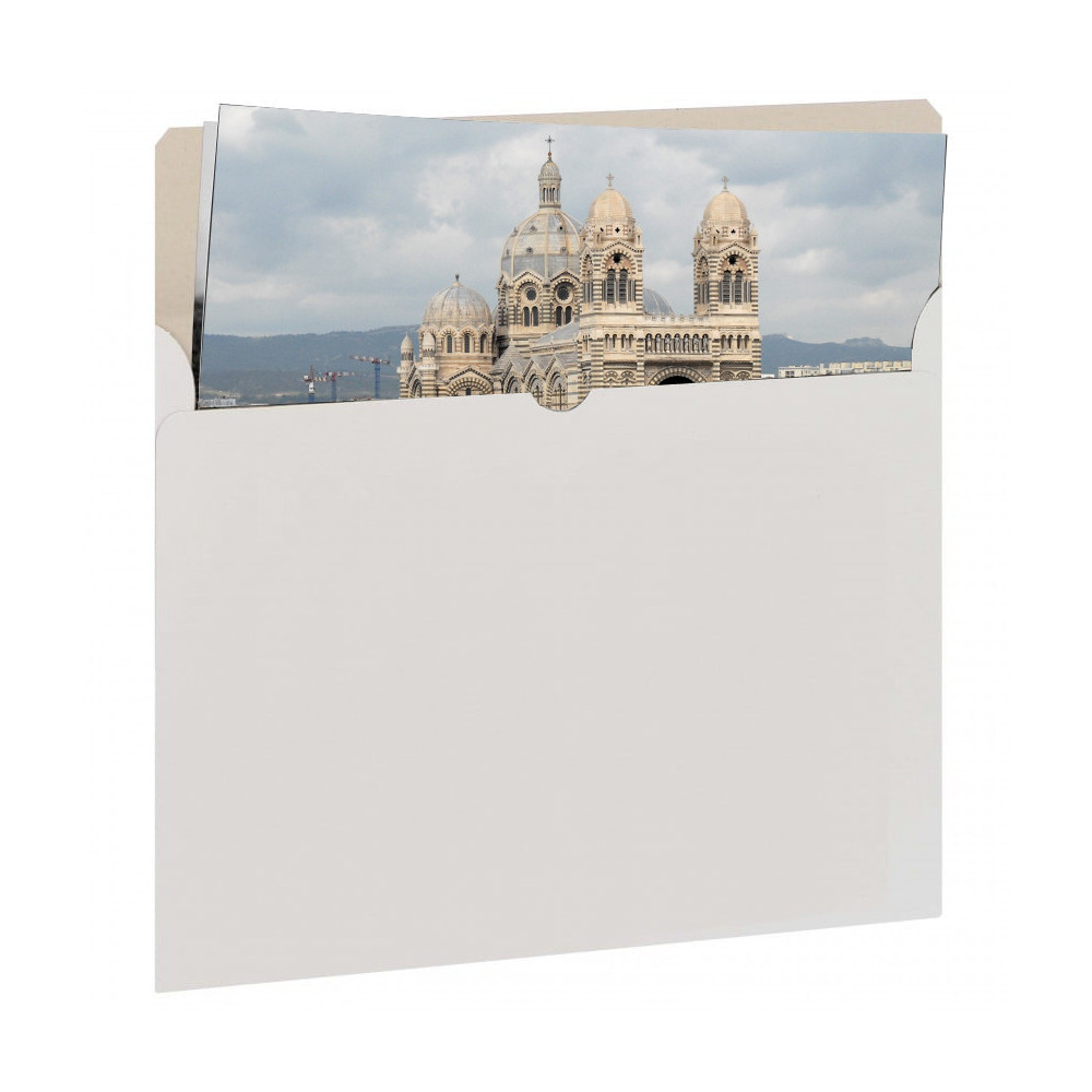 Le rabat simple sans adhésif est volontairement pensé pour un usage professionnel : il permet une ouverture rapide, sans risque de collage accidentel ni de traces sur le tirage. L’esthétique blanche, sobre et neutre s’adapte à tous les styles de photographie et valorise le travail livré, que ce soit pour une commande client, une exposition ou une remise en main propre.